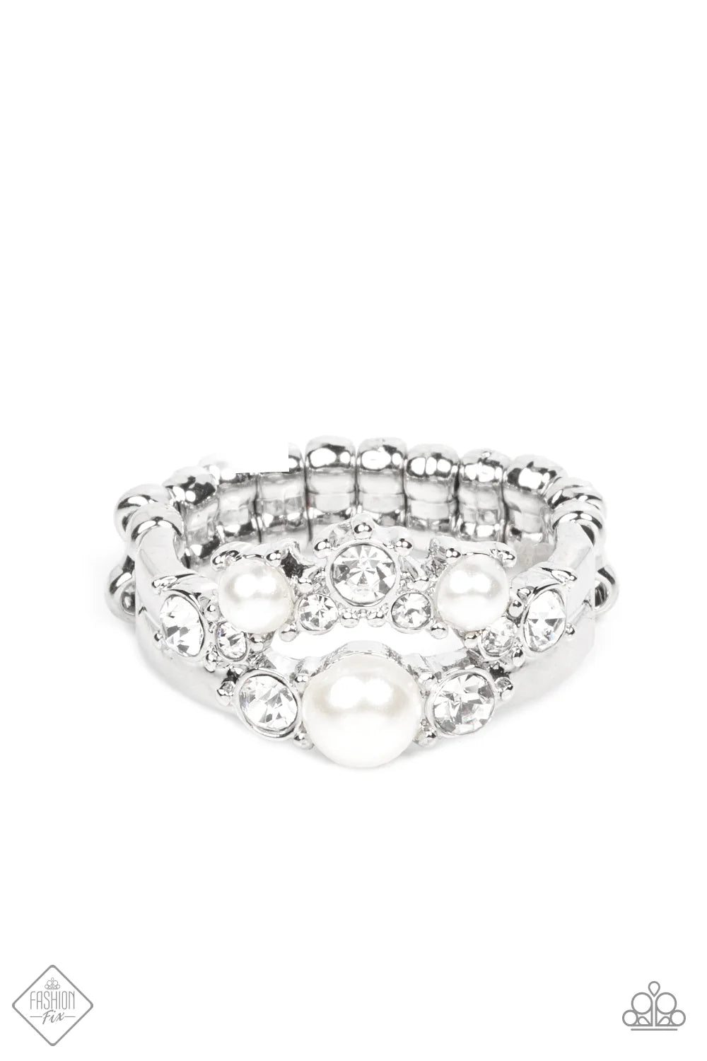Featuring pronged silver fittings, a bubbly collection of white pearls and glassy white rhinestones coalesce into two effervescent bands across the finger. Features a dainty stretchy band for a flexible fit.