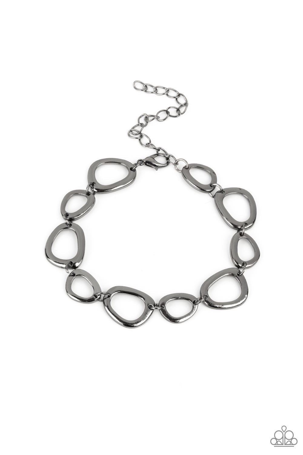 An array of irregular shaped gunmetal rings link together and make their way around the wrist for a simple yet stylish avant-garde fashion. Features an adjustable clasp closure.