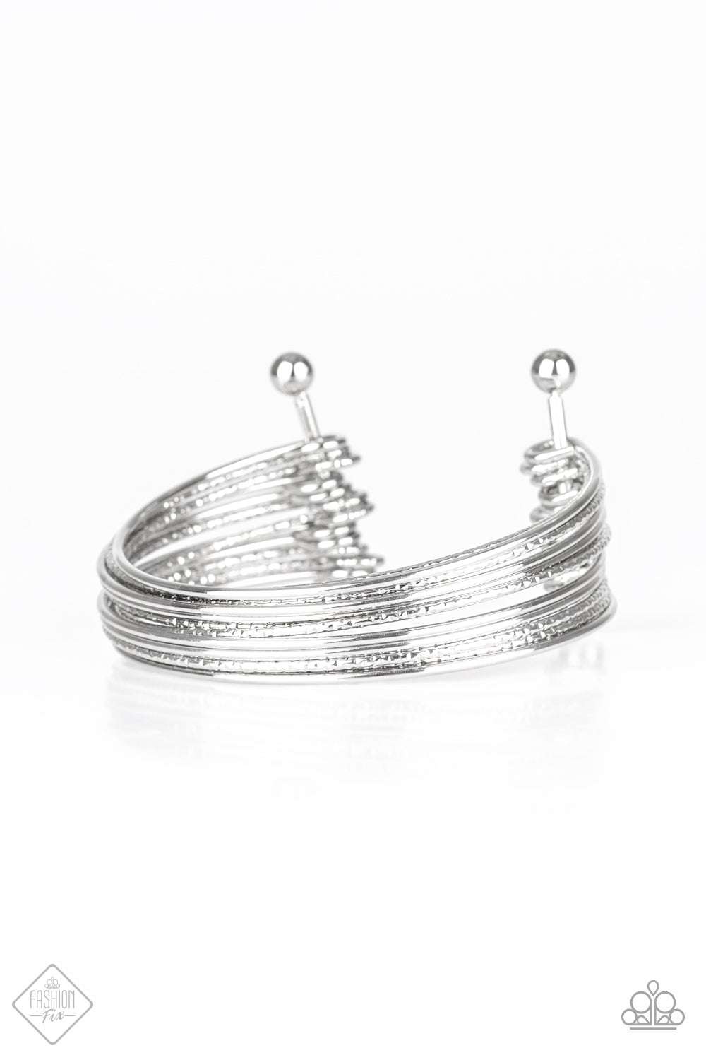 Attached to two silver rods, smooth and textured silver bars curl around the wrist, creating the illusion of a timeless stack of bangles.