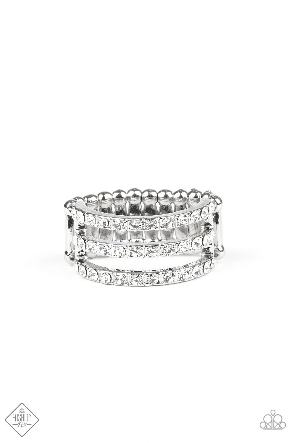 Ring: "Seeking Shimmer" (P4RE-WTXX-359RI)- Row after row of white rhinestone encrusted bands stack across the finger, coalescing into a timeless centerpiece atop the finger. Features a stretchy band for a flexible fit.