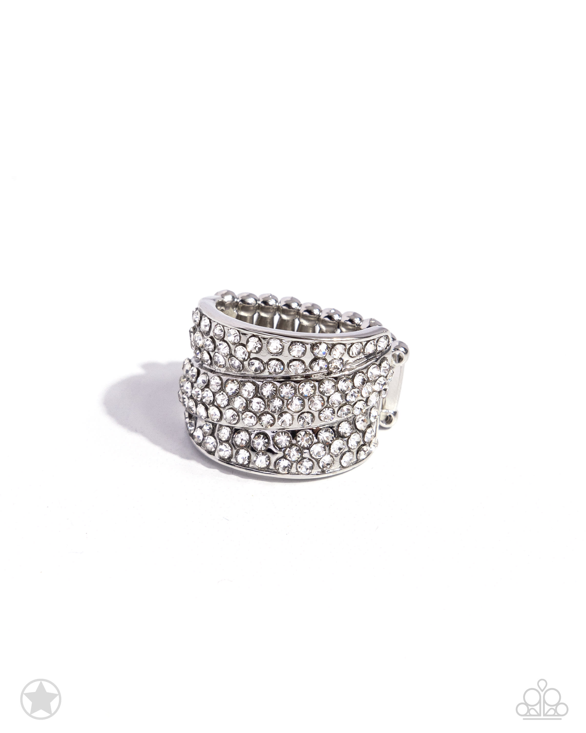 Row upon row of glistening white rhinestones stack into an incandescent display. An additional row of sparkling rhinestones wraps diagonally across the band for an extra splash of refined shimmer. Features a stretchy band for a flexible fit.