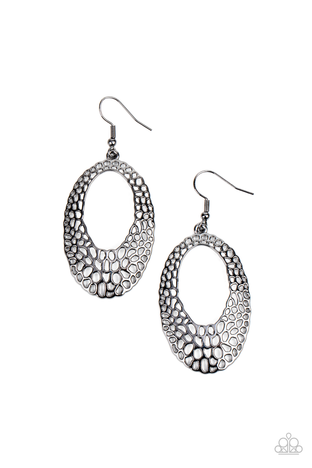 Stenciled in an asymmetrical hole pattern, a gunmetal oval frame swings from the ear for an abstract fashion. Earring attaches to a standard fishhook fitting.
