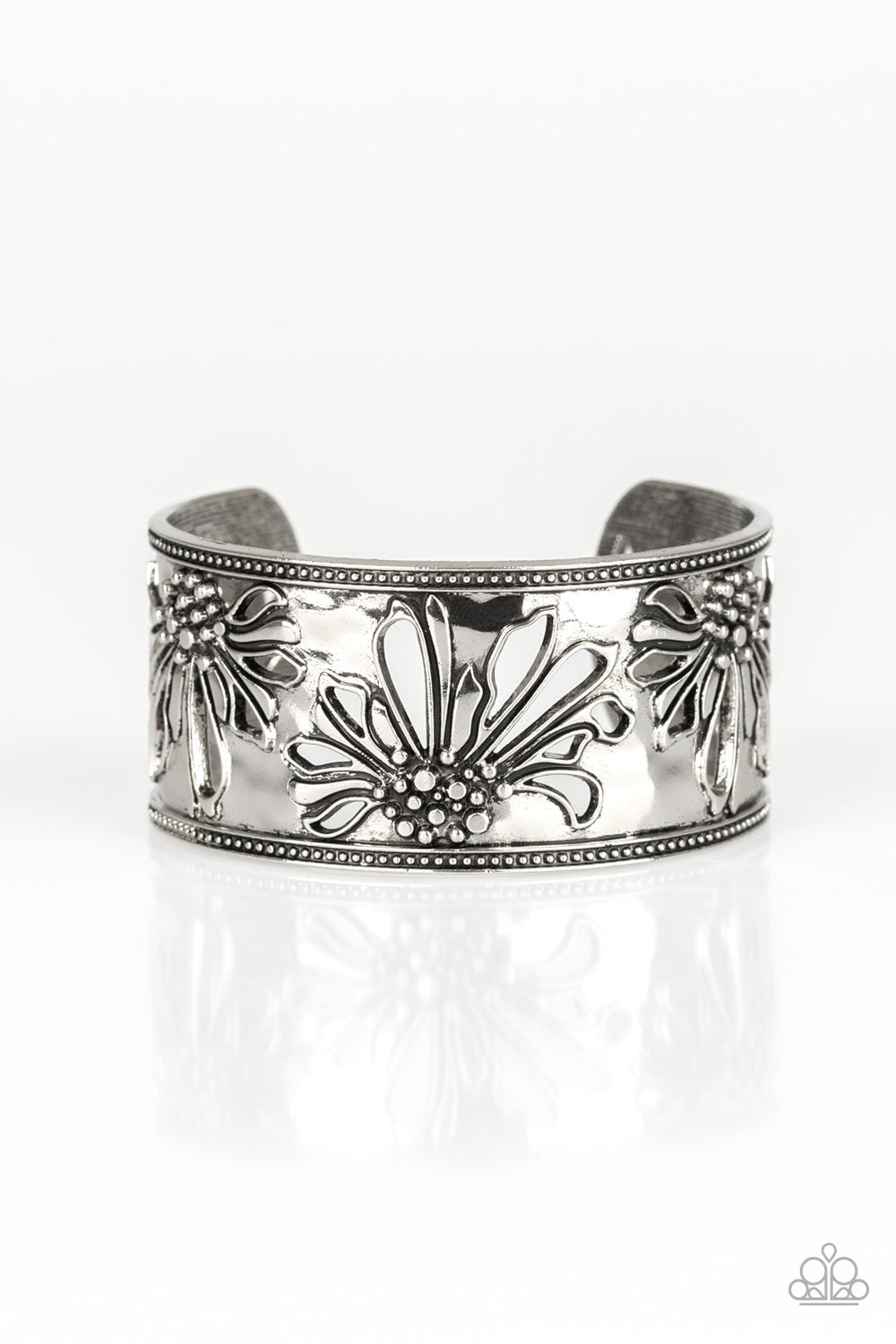 A hammered silver cuff is embossed and stenciled in an airy wildflower pattern for a seasonal look.